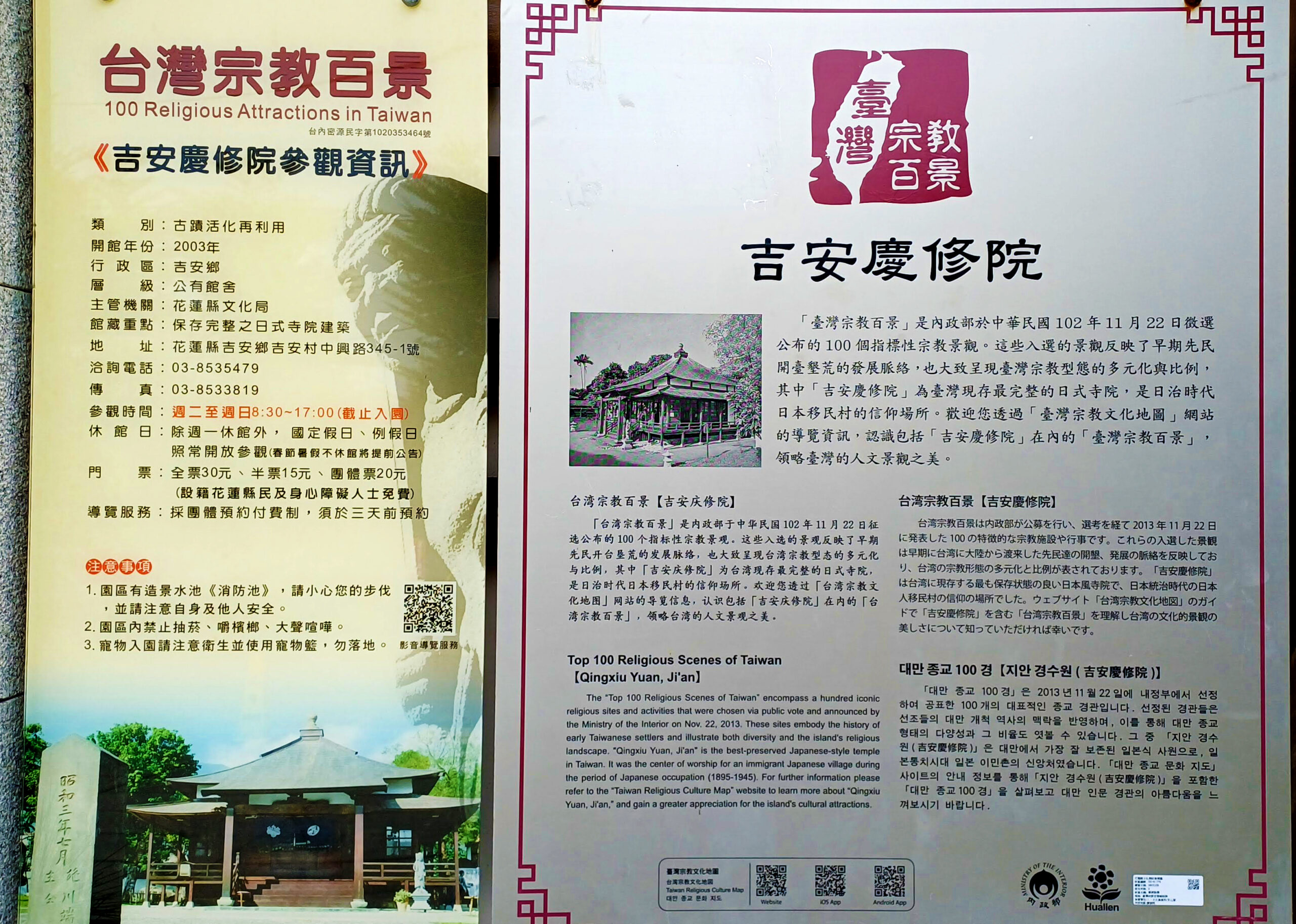 吉安慶修院位於花蓮吉安鄉,是臺灣現存最完整的日系寺院建築。原為「吉野布教所」,遵循日本傳統高野山真言宗風格,整座建築散發濃厚江戶風情,被列為國家三級古蹟。園區內最著名的景觀為「八十八尊石佛」,象徵巡行日本四國的弘法大師足跡,供信徒與遊客祈福。院內環境清幽,木造主建築、洗手舍與日式枯山水庭園相映成趣。遊客可在此體驗掛繪馬、穿浴衣拍照,感受如置身日本的寧靜氛圍。